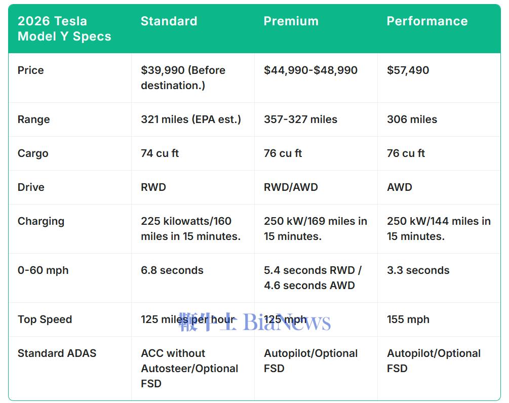 EPA 预估续航里程为 321 英里,仅略低于现款长续航后轮驱动版 357 英里的续航里程。最高充电速度也从 250 千瓦略微降至 225 千瓦。Model Y 0-60 英里/小时加速时间为 6.8 秒,比 Model Y Premium 慢,后者后轮驱动版加速时间不到 6 秒,全轮驱动版加速时间不到 5 秒。