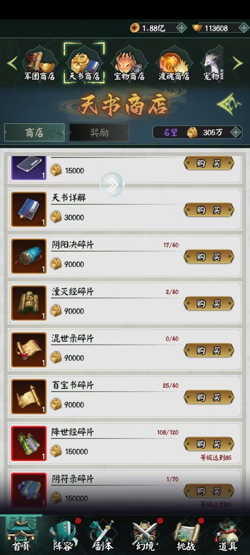 天书商店初期切勿急于兑换强化材料或普通书籍碎片,应优先积攒资源。待等级达到85级后,开启红色书籍碎片兑换,每片需15万积分,集齐一套共需1800万积分。若前期未妥善储备积分,将难以第一时间兑换红书,错失快速提升战力的良机,落后于他人。