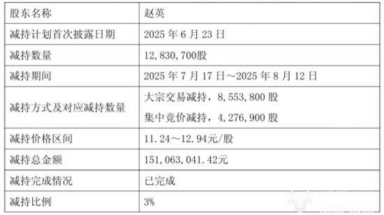 据有友食品发布的公告,公司实际控制人赵英因个人资金需求,通过集中竞价及大宗交易方式减持公司股份1283.07万股,占公司总股本的3%,累计套现1.51亿元,减持完毕后,赵英仍然持有有友食品9.95%的股份。