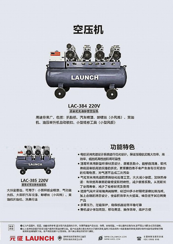 在工业生产与生活服务的诸多场景中,空压机作为提供动力的核心设备,其性能优劣直接影响着工作效率与质量。元征(LAUNCH)推出的活塞式无油静音空压机,凭借先进技术与出色设计,成为各领域的理想之选,为不同需求的用户带来高效、可靠的动力支持。