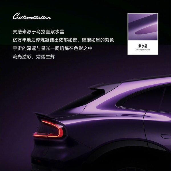 官方介绍,紫水晶车漆的深邃和通透来自一次又一次耐心的雕琢,折射出更澄澈的紫调,夜色中更显深沉与冷静,最终呈现出的不只是光亮的漆面,而是一面可以映照世界的镜子。
