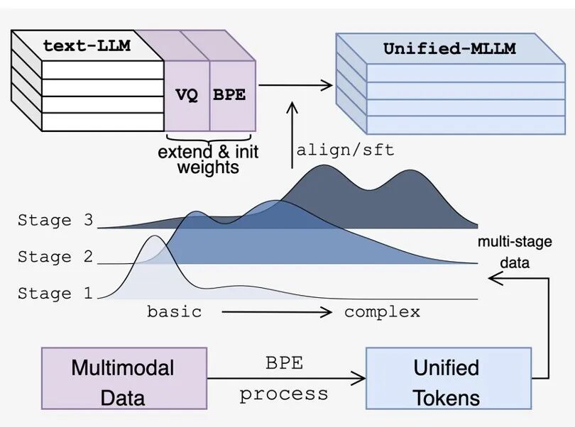 Stage-1 / Embedding Alignment:只训练新扩展的视觉 token embeddings(包括 VQ 与 BPE 两部分),其余参数全部冻结,完成基础对齐而不扰动原有语言能力。