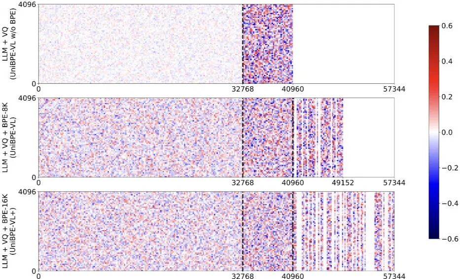 Embedding 权重的可视化揭示了词表设计对跨模态表征的影响:在不使用 visual BPE 的基线模型(上图)中,文本与视觉 token 的权重呈现显著偏置与分离,体现出明显的模态隔阂;而引入不同词表大小的 visual BPE(中、下图)后,两类 token 的权重分布趋于均衡与同构,说明 BPE 在更细粒度上对齐了子词 / 子片段层面的统计与表征空间。由此带来的直接效应是跨模态注意力的共享基准更一致、梯度信号更可比,从而降低模态间的分布漂移与共现偏差。