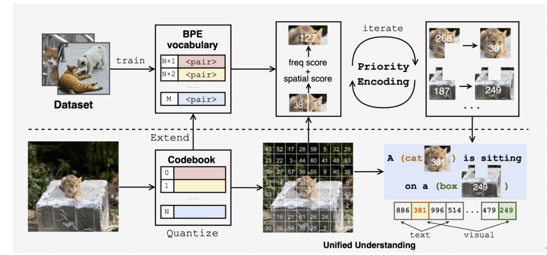 文本大模型中的 BPE 只看「谁和谁经常相邻」。在视觉里,如果只按频次去合并,容易破坏结构。Being-VL 因此提出 Priority-Guided Encoding:基于 score P (a,b)=F (a,b)+α・S (a,b) 进行 BPE 词表构建,其中 F 为邻接频次,S 衡量在不同图像中的相对位置一致性,相似度用高斯核对齐。这样得到的视觉词表既覆盖高频模式,又保留空间结构。并且这个过程完全不依赖文本。