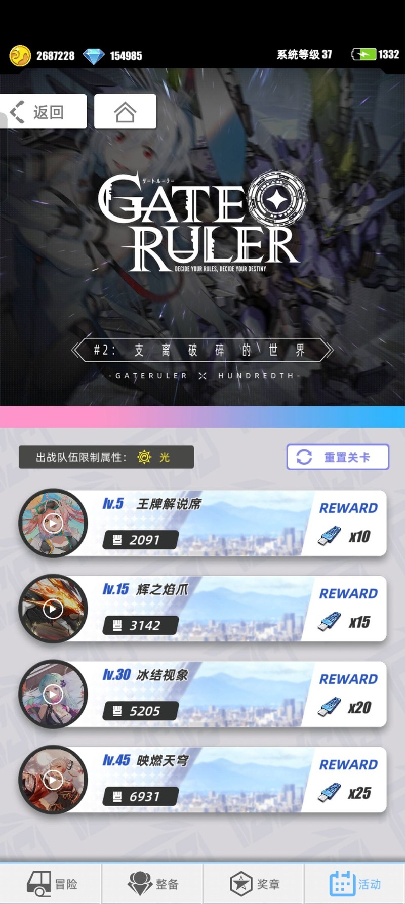 第二关有属性限制,仅能使用光属性角色出战。难度越高,获得的作战记录越多,但每次挑战都会消耗门票,每日最多挑战三次,最低可得30记录,最高75记录。可刷新敌方阵容,但失败也会消耗门票。该关卡难度较高,新手建议适当降低目标,减少难度进行挑战。