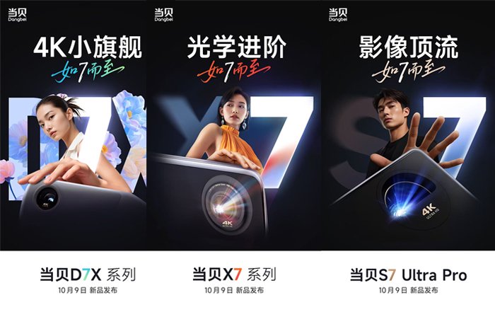当贝X7系列海报中,“光学进阶,如7而至”,也表明定位高端投影的当贝X7系列也将迎来新品,主打高端投影新标杆,画面体验全面进阶。