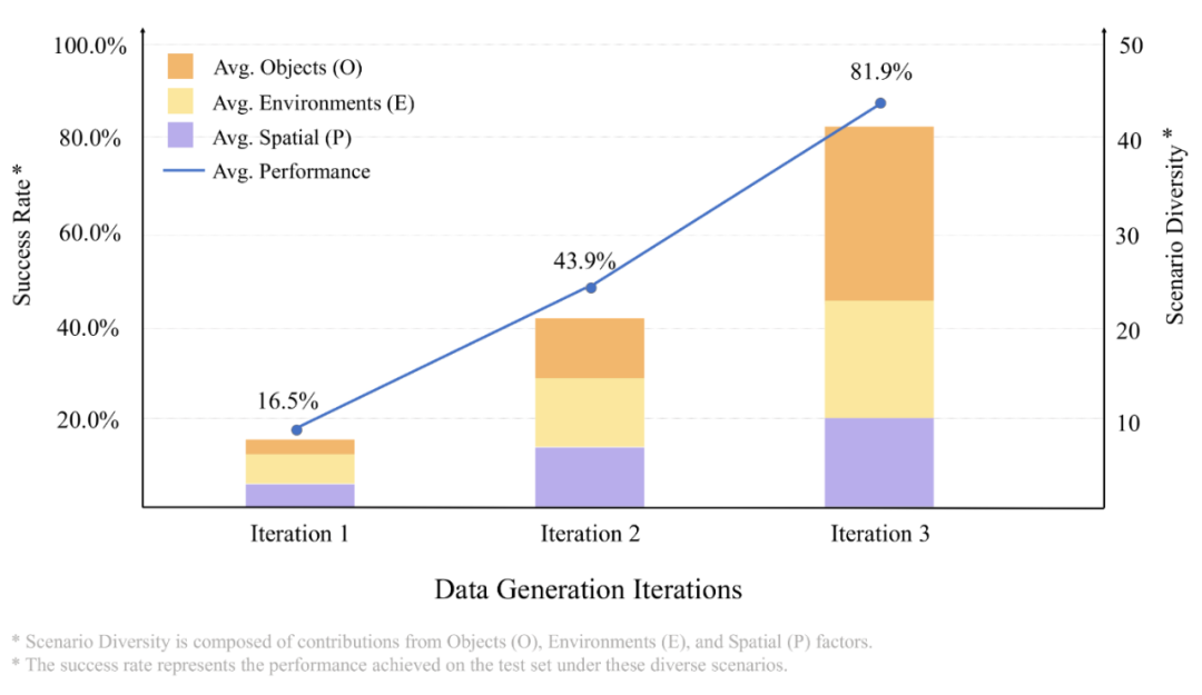 在包含物体、环境、空间布局三重变化的挑战性测试集上,成功率从初始的 16.5% 提升至 81.9%。