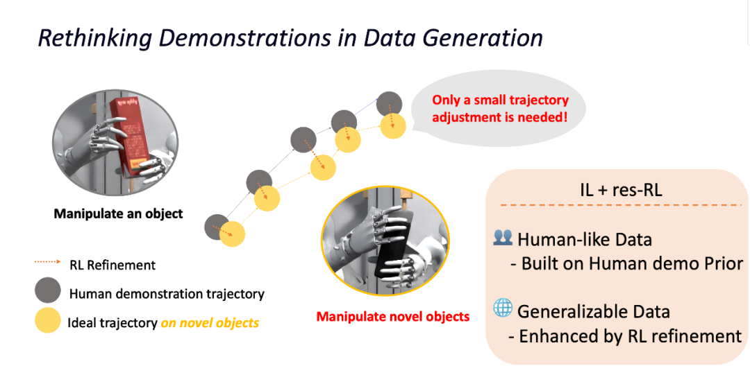 团队基于关键发现 —— 操作不同物体时轨迹往往只需细微调整,设计了 “模仿学习 + 残差强化学习” 方法来将演示迁移到新场景。一方面,模仿学习保证轨迹保持人类演示的自然性;另一方面,残差强化学习对轨迹进行精细微调,使其适应新环境。最终,通过组合策略,能够高效生成多样化且类人的轨迹数据。