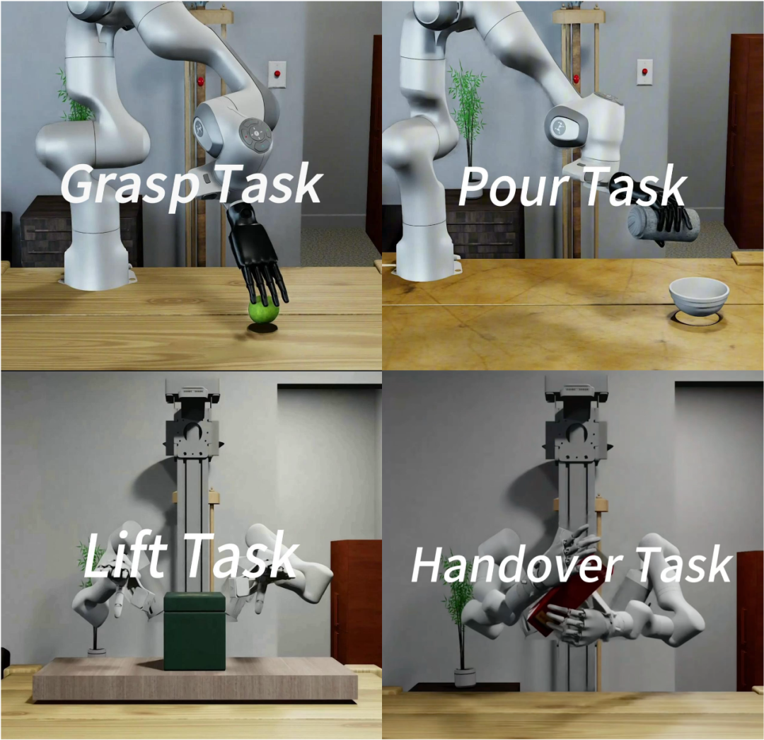 四个灵巧手任务:单手抓取、单手倾倒、双手提起、双手交接。