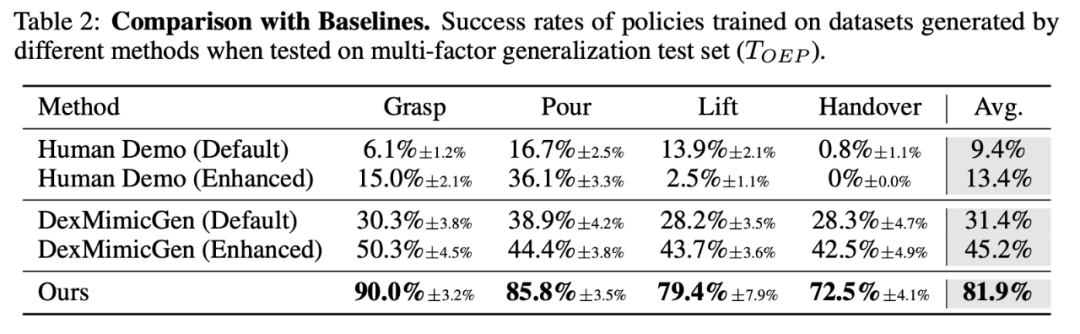 训练策略性能:在多样且具有挑战性的测试集上,策略成功率达到 81.9%,超过基线 DexMicmicGen (31.4%) 和人类示教 (9.4%)。
