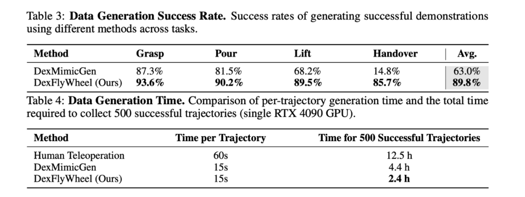 数据生成成功率:在多样且有挑战性的场景下,DexFlyWheel 数据生成成功率达到 89.8%,明显高于基于轨迹回放的基线方法 (63.0%)。