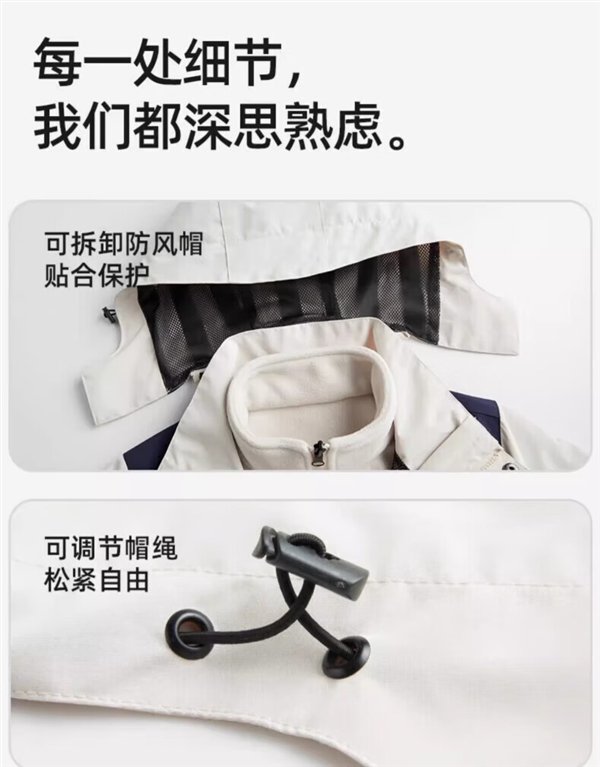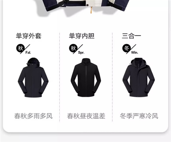 采用三合一的结构,包含一件外套和一件内胆。可根据不同的天气状况灵活搭配。