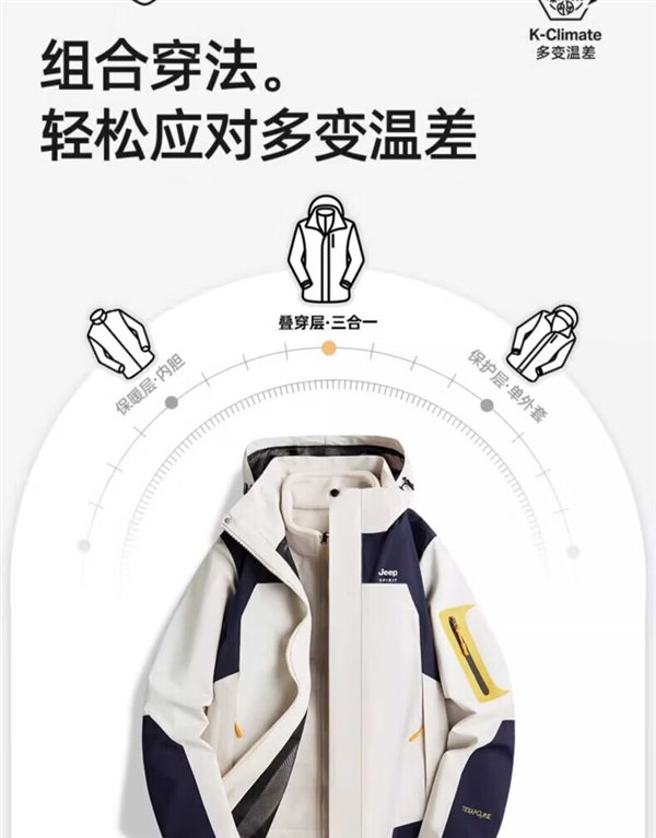 防风防水 / 保暖锁温,JEEP SPIRIT 户外三合一冲锋衣,报价 229 元,下单领取 20 元店铺券 + 110 元品类券,实付 99 元包邮。
