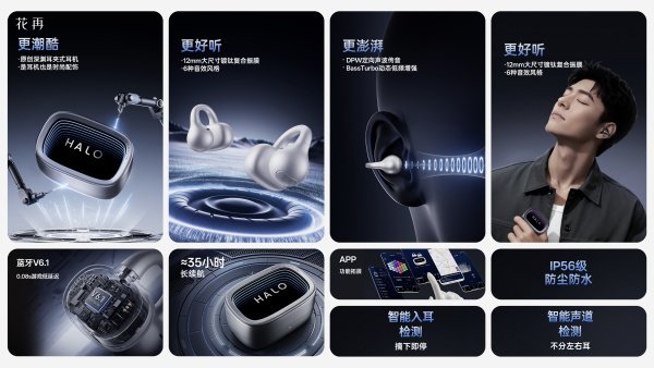 搭载新一代蓝牙 V6.1 技术,带来连接效率、抗干扰能力与功耗控制的全面革新。在复杂环境中,提供纯净无染的音频信号。配合约35小时长续航和IP56级防尘防水,在快节奏的生活中更添一份随心所欲的从容。HALO CLIP新增一键震动排水功能,让使用无惧汗雨。