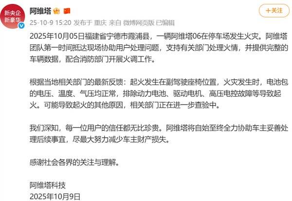 2025年10月5日福建省宁德市霞浦县,一辆阿维塔06在停车场发生火灾。阿维塔团队第一时间抵达现场协助用户处理问题,支持有关部门处理火情,并提供完整的车辆数据,配合消防部门开展火调工作。