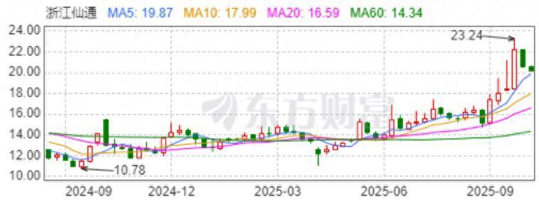 二级市场上,浙江仙通表现颇为亮眼,一度触及23.24元/股高点,距离一年前10.78元/股的低点,已经成功**。