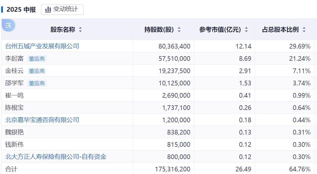 2024年12月,公司控股股东台州五城基于对公司未来发展前景的信心及中长期价值的认可,开展了未来12个月内的增持计划。截至2025年6月底,台州五城累计增持1,613,400股股份,目前持有上市公司80,363,400股股份,占总股本的比例为29.69%。