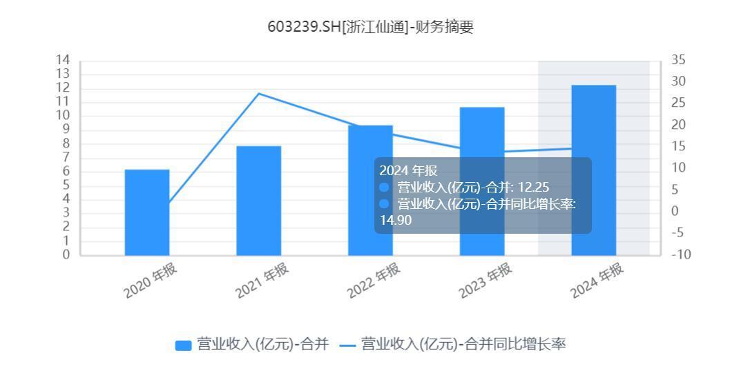2024年,浙江仙通实现营业收入12.25亿元,同比增长14.90%;净利润1.72亿元,同比增长13.70%,双双创历史新高。良好的增长势头延续到了今年上半年,公司实现营业收入6.72亿元,同比增长21.1%;归母净利润1.07亿元,同比增长17.1%。