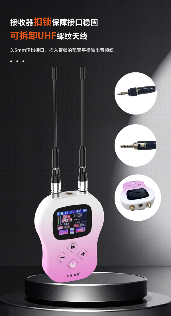 接收器配备扣锁结构,保障接口稳固,搭配带锁的平衡输出音频线,防止意外松脱。可拆卸UHF螺纹天线设计,方便携带与更换,保证信号传输更稳定。