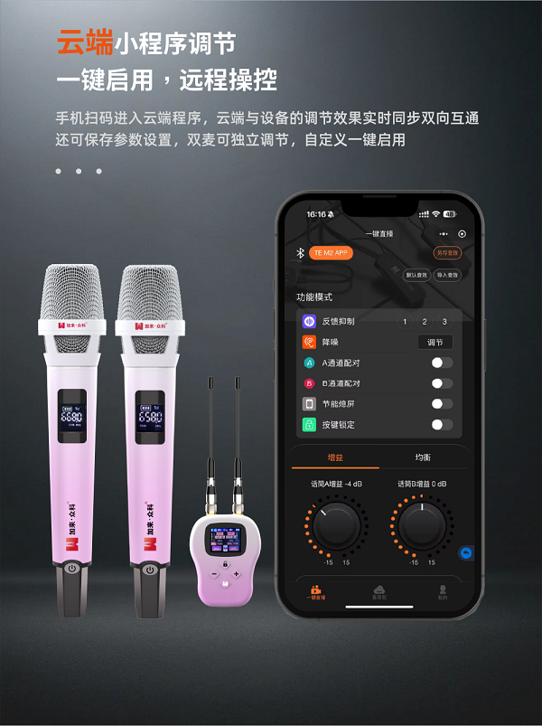TE M2既可一拖一使用,也支持一拖二使用。通过云端小程序,可对两支麦克风进行独立参数调节。无论是二人对唱还是双人直播,都能自由匹配最佳音效,满足不同声音需求和场景应用。