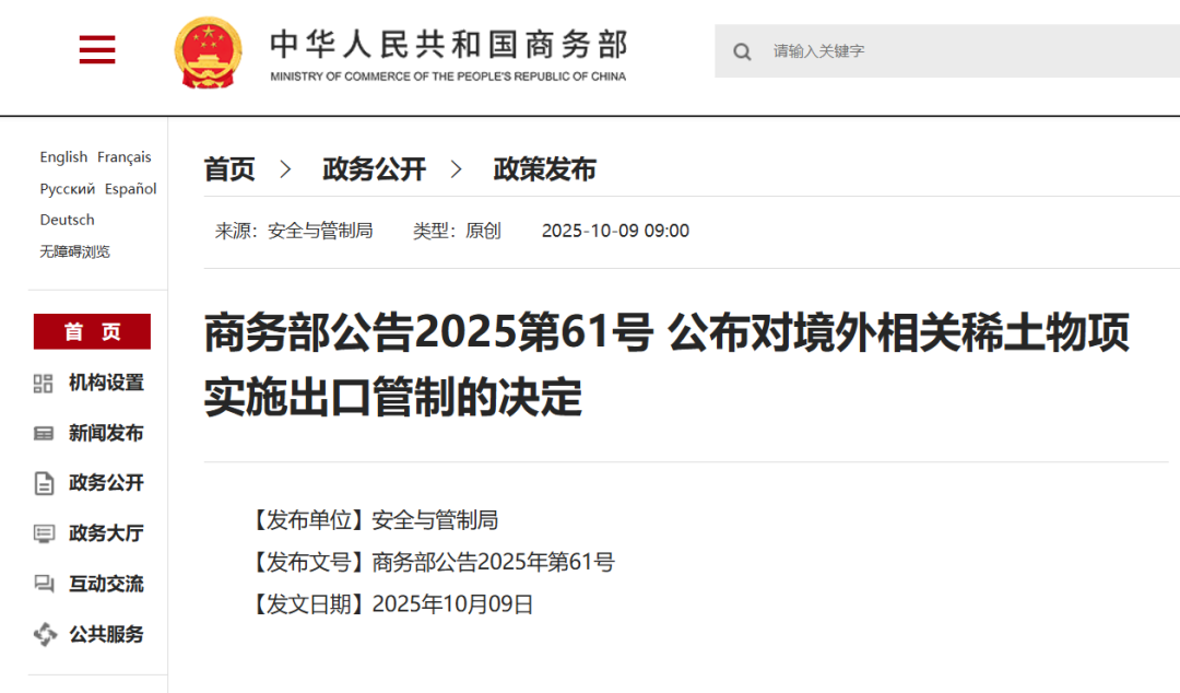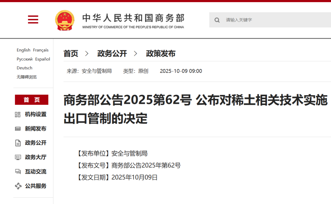 10月9日,商务部发布2025年第61号公告,公布对境外相关稀土物项实施出口管制的决定;发布2025年第62号公告,公布对稀土相关技术实施出口管制的决定。
