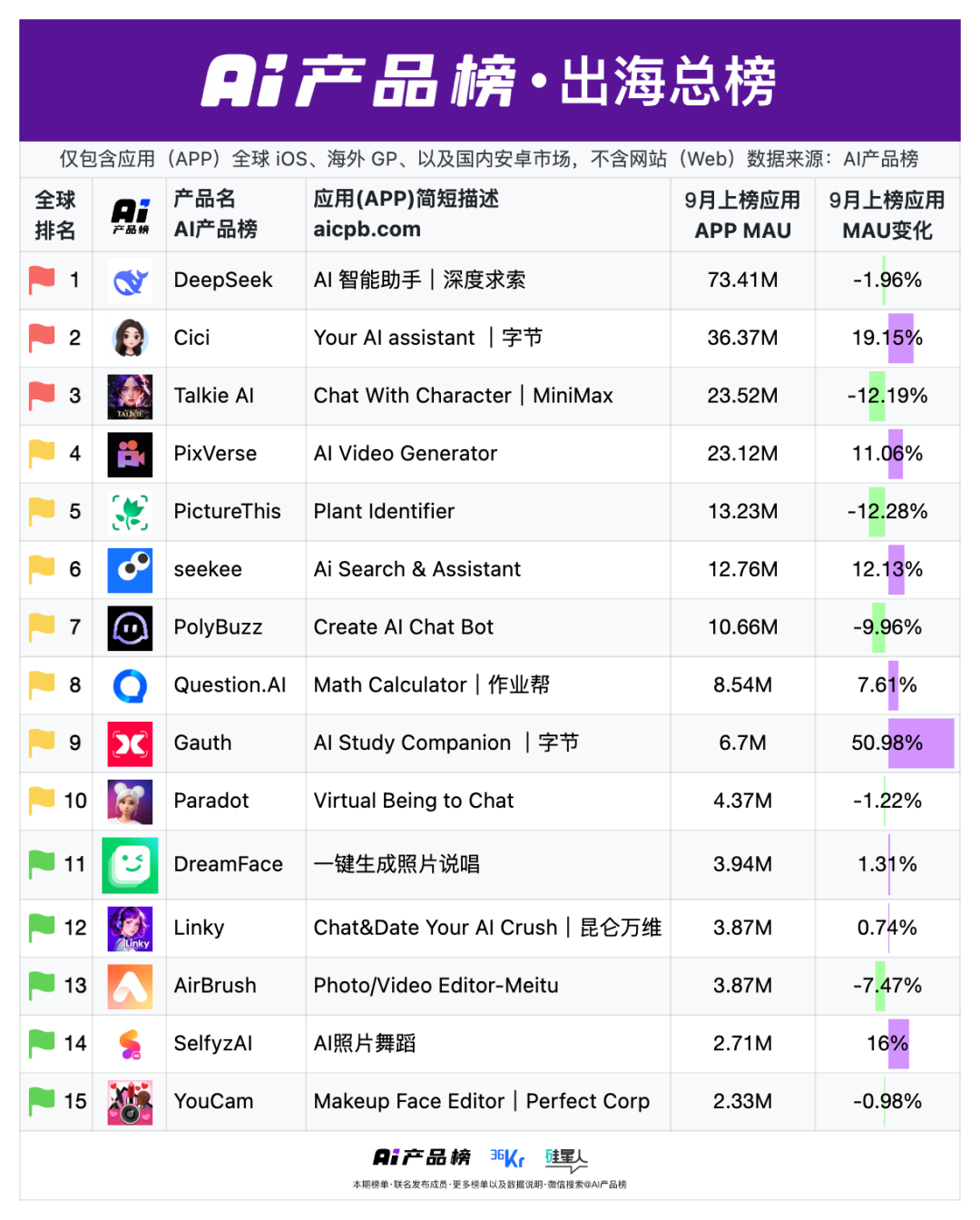 AI产品榜·出海总榜前五:Deepseek、Cici、Talkie、PixVerse、PictureThis,其中PixVerse也是视频生成类创意工具。