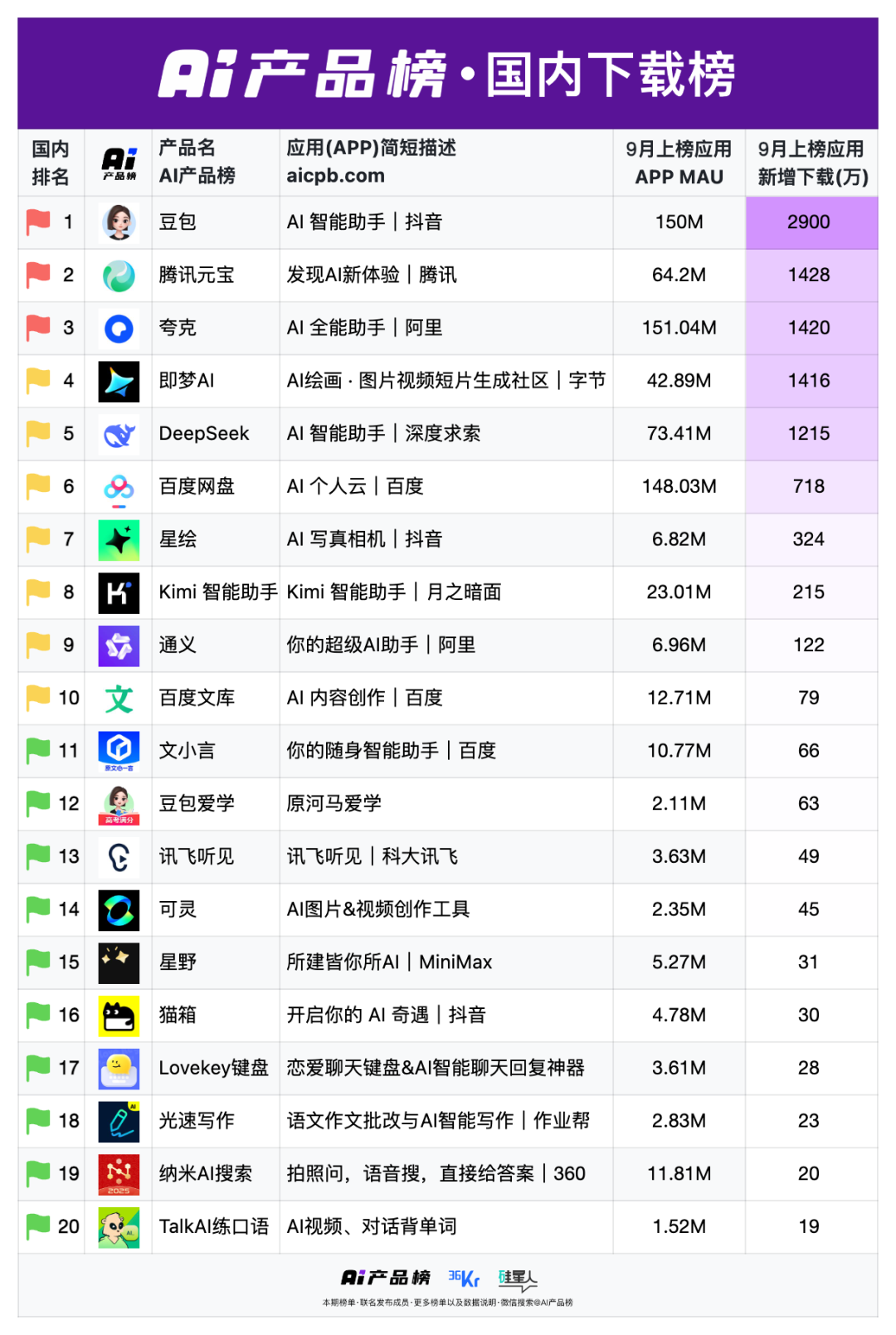 AI产品榜·国内总榜前十:夸克、豆包、百度网盘、Deepseek、腾讯元宝、即梦AI、Kimi、百度文库、纳米AI搜索、文小言。