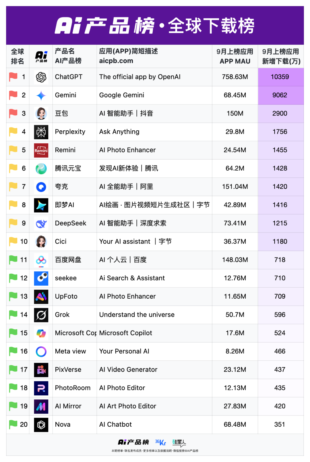 第14期 AI产品榜·应用榜(APP)(2025年09月)由AI产品榜、36kr、硅星人联名发布。AI产品榜2025年09月榜,本文里包含9个AI榜单。