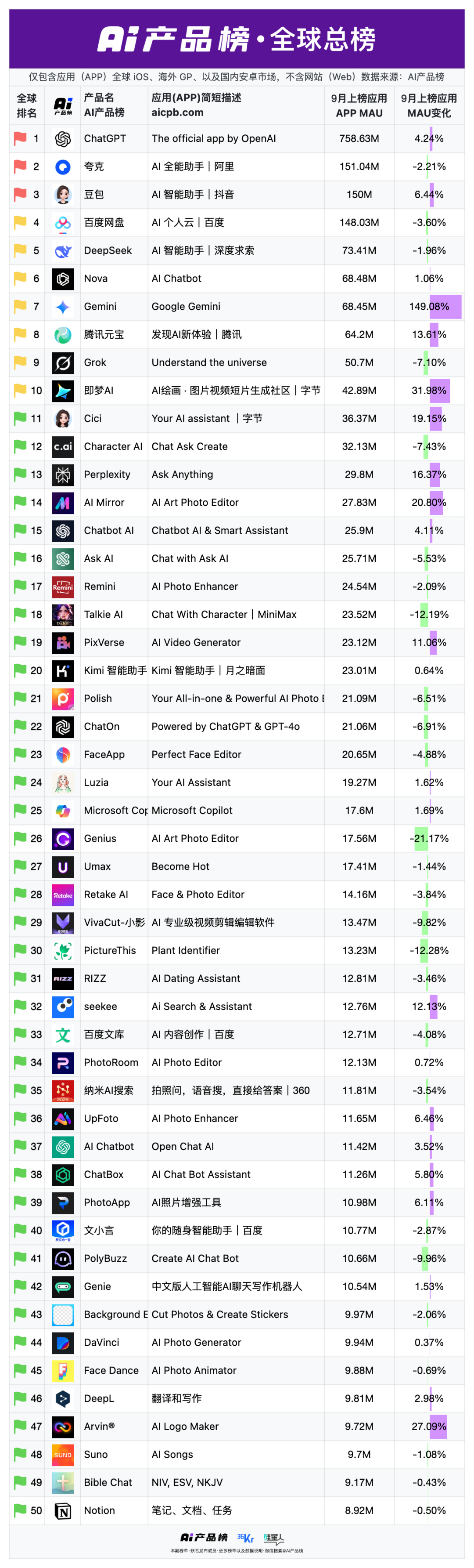 到目前为止无论Chatbot、搜索类产品都是ChatGPT的产品形态,本质上没变化,ChatGPT2025年9月以7.58亿月活用户位居AI产品榜·全球总榜第一,已是全球十大应用(包含非AIAPP)排名第九,比X(Twitter)月活用户还多两个多亿。