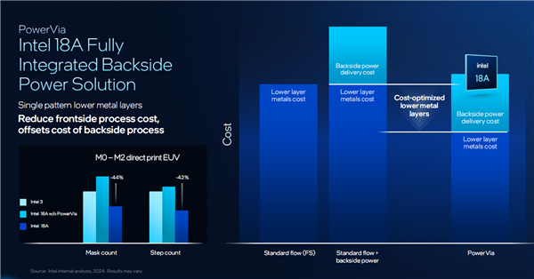 当然,单纯使用背部供电,成本会显著增加,但是Intel PowerVia是一个完整方案,同时还有一系列配套优化,包括减少金属层、遮罩数量、工序步骤,以及精简正面工艺等等,使得综合成本显著低于传统正面供电工艺。