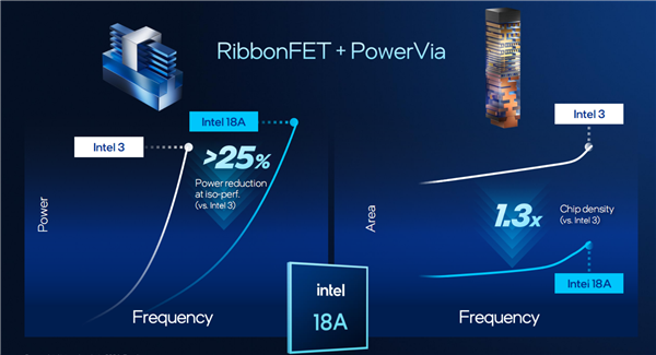 RibbonFET、PowerVia两大变革结合,使得Intel 18A对比Intel 3综合能效提升最多15%、同等性能下功耗降低最多25%、芯片密度提升30%。