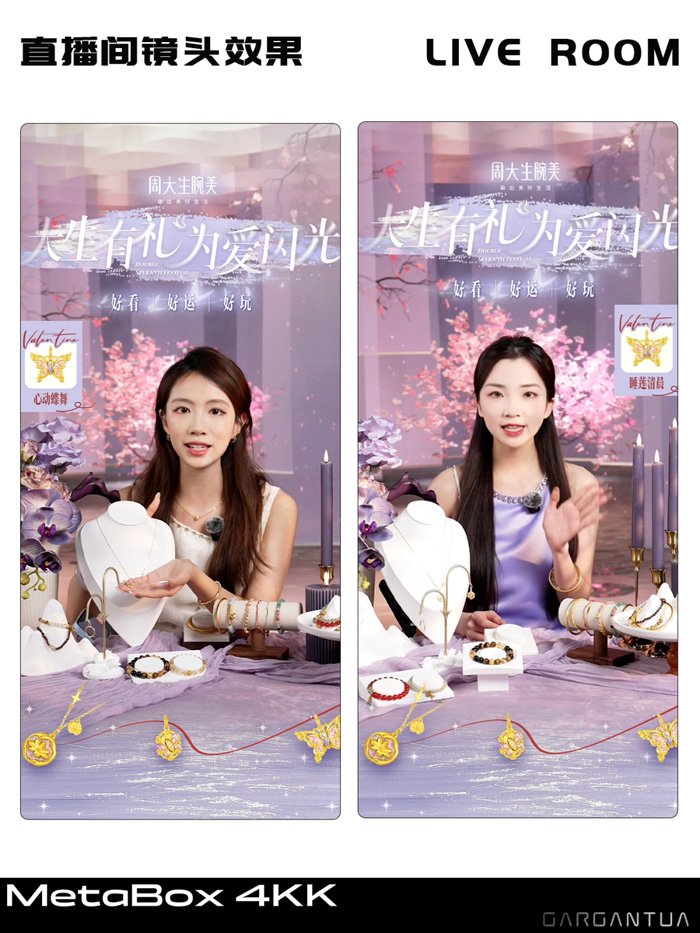 迎合七夕营销节点,周大生腕美XR直播间场景进行升级!围绕“大生有礼·为爱闪光”主题,结合莫奈花园系列产品的紫色视觉色彩,打造神秘浪漫的「仲夏幻梦」美景。直播互动聚焦腕间艺术,引入DIY串珠环节,感受能量哲学与视觉美学的双重碰撞,解锁别样腕上风采。
