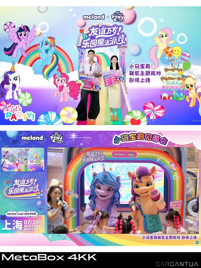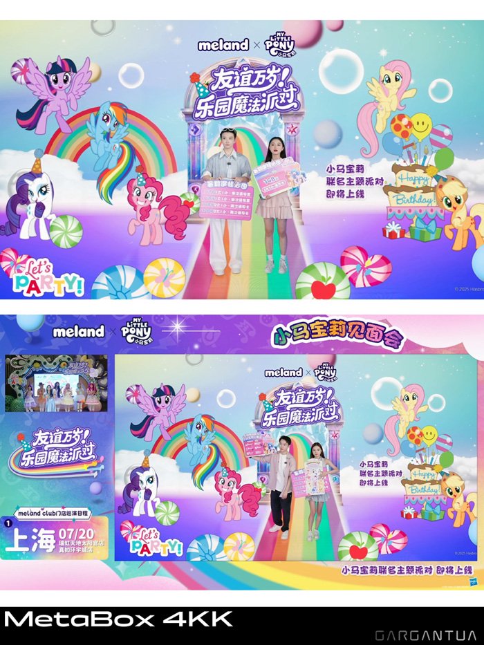 通过MetaBox 4KK打造专属彩虹桥云感背景+水晶拱门,构建沉浸式视觉场域;同频线下见面会活动,切换横屏画中画模式,IP角色动态跃现,深化品牌“童趣消费”核心印象,一键进入专属“魔法派对”。