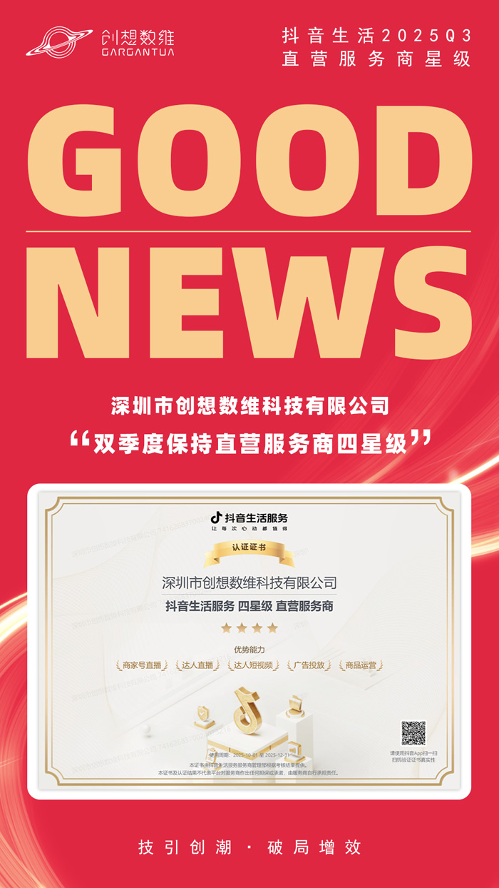 该星级认证是抖音官方对服务商运营能力、经营能力、创意策划以及效果达成的综合评定。双季度连续获得这一认证,也印证了创想数维作为XR技术型服务商的专业能力与创新水准。