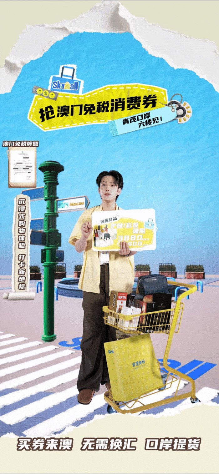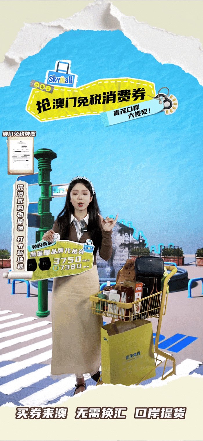 青茂口岸免税店skymall新店开业盛典专场直播,以“纸质拼贴手账本+澳门文旅地标”为视觉锚点,用拼贴重组视觉+撕纸艺术形式,营造“一眼踏入澳门”穿越感。