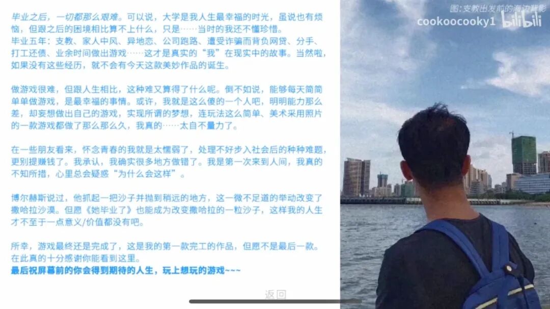 去年另外一款“抽象流”国产AVG《暮雨流花》也因为6元售价引发过争论《她毕业了》的主要问题在于:其创作者独游人煎饼确实是独立游戏领域的资深人士,至少比一般玩家的了解要深入不少。