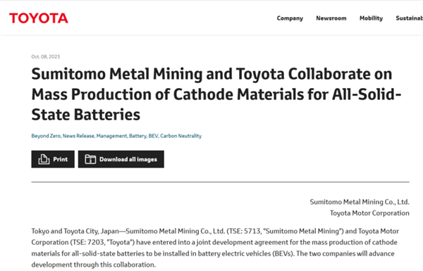 快科技10月9日消息,近日,丰田汽车通过全球官网宣布,已与住友金属矿山株式会社(下称 “住友金属矿山”)达成合作协议——双方将围绕纯电动汽车(BEV)用全固态电池正极材料的量产展开协作,共同加速相关技术的研发进程。