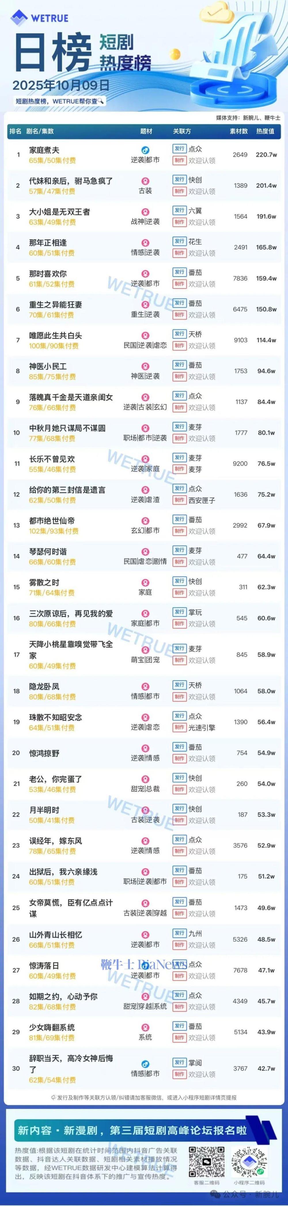 1、本日榜为WETRUE短剧数据公司提供,新腕儿和鞭牛士提供联合支持。