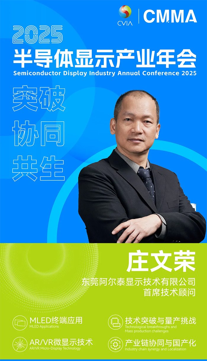 10月11日,AET阿尔泰首席技术顾问庄文荣将出席2025半导体显示产业年会并发表“Micro级MIP标准显示产品应用”主题演讲,敬请期待!