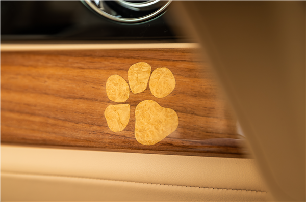 车内皮革颜色与贝利的毛色深度匹配,后排座椅之间的核心装饰是一幅由180片天然木饰面拼接而成的贝利肖像画,工匠们运用9种珍稀木材,通过木材本身的颜色和纹理,还原出贝利的神态与毛发光泽,甚至连吐出的舌头都采用4种劳斯莱斯历史上从未使用过的木材精准呈现。