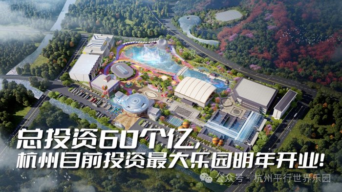 杭州平行世界乐园综合体,位于杭州市区超山风景区旁,投资约60亿,由乐园、酒店、水乐园三大版块组成,集宋韵、演出、科幻、游乐、大型酒店、室内室外水乐园于一体。