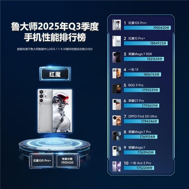 其中,红魔10S Pro+再度以1900420分蝉联手机性能榜冠军,也是本季度性能榜中唯一整机突破190万性能分的机型。
