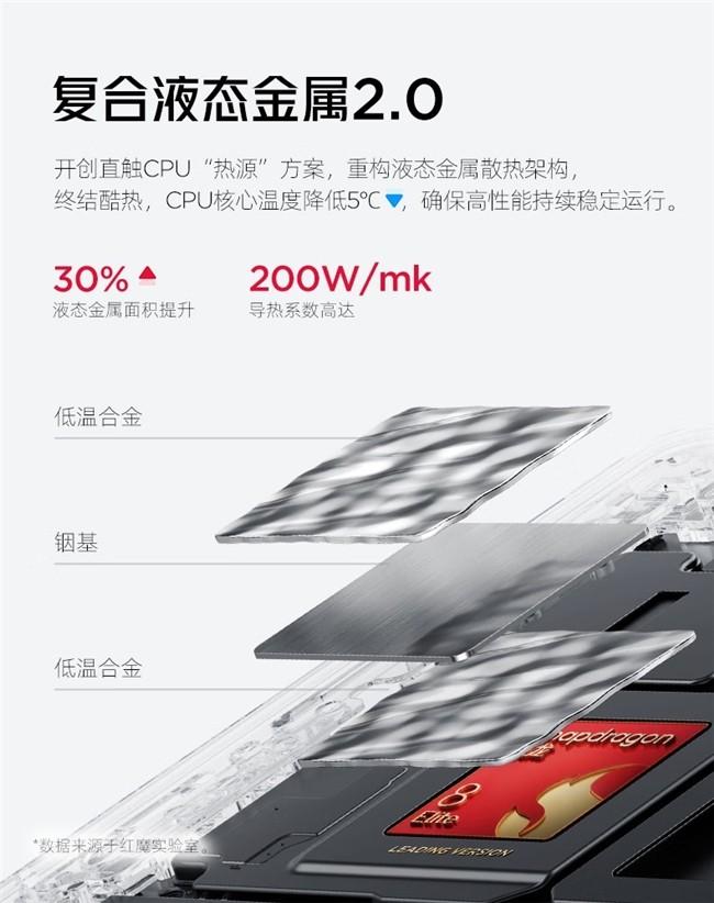 其制胜关键不仅有最高主频4.47GHz的骁龙8至尊 领先版,还在于其首创的液金直触SoC以及祖传的主动散热风扇给予的超高散热效率。