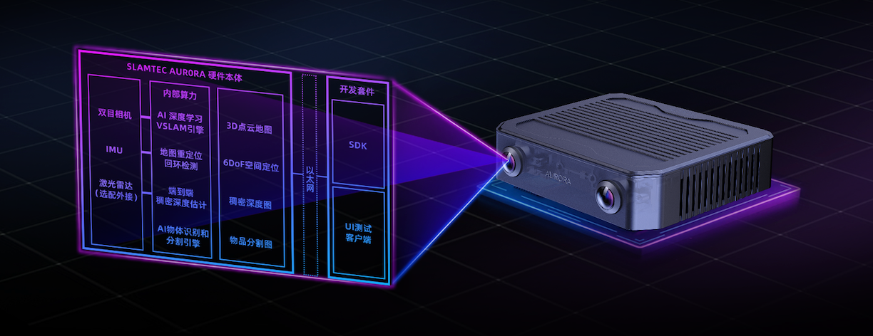 Aurora S最大的革新在于高度集成化。它带有思岚自研的深度学习AI-VSLAM算法提供全3D的地图构建和定位能力以及端到端神经网络的双目深度估计和语义识别能力,而所需的算力硬件,全部集成于仅238克的紧凑机身内。