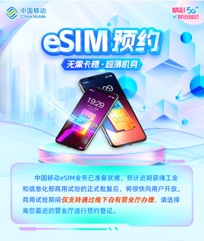 值得注意的是,中国移动还表示,eSIM业务商用试验期间仅支持通过线下自由营业厅办理,用户需到营业厅进行预约登记,暂不支持委托代办、线上办理及境外用户申请。