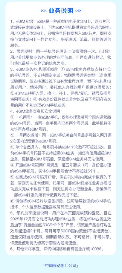 相较之下,中国移动在业务规则说明方面更为详尽,包括同一身份证办理的eSIM+实体SIM号码总数不得超过5个、单台eSIM手机最多激活2个国内运营商号码、单个号码每月补换卡次数限制为5次等。