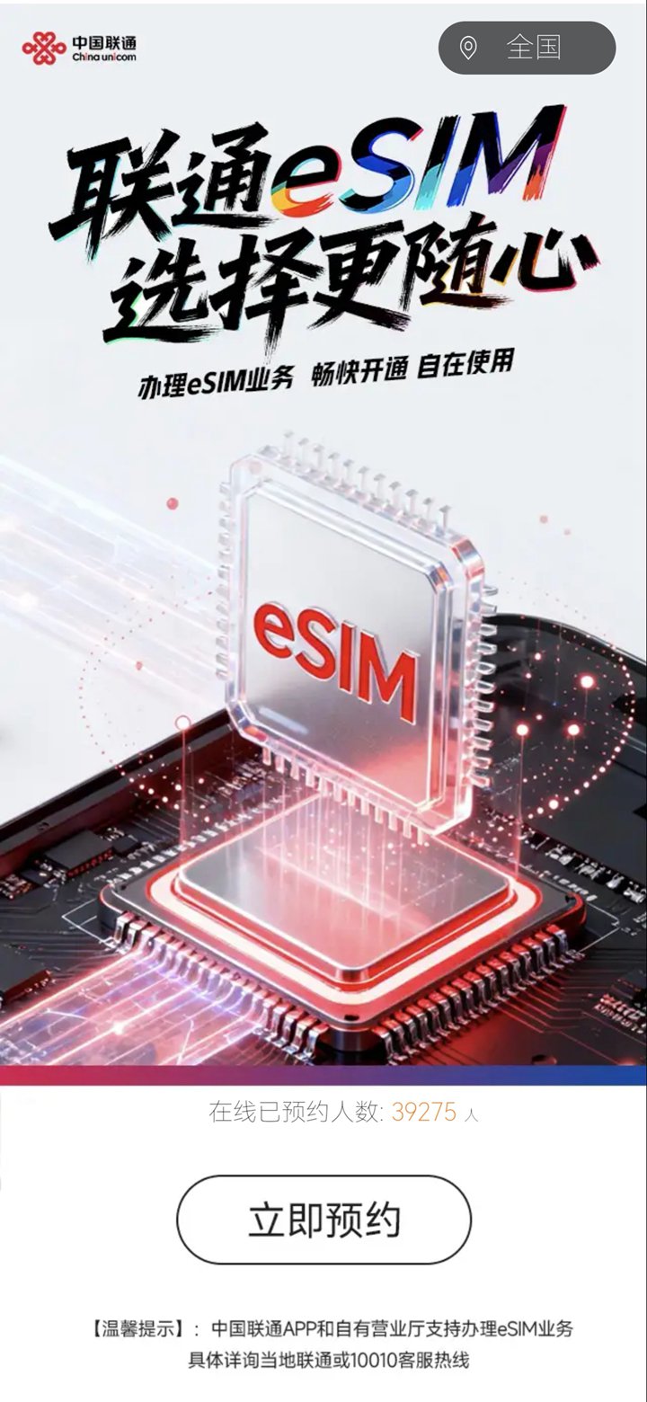 C114讯 10月10日消息(颜翊)日前,中国联通正式开启 eSIM 业务预约通道,截至今日,线上预约人数已突破3.9万人。