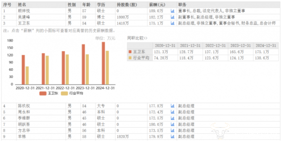 而虽然王卫东身兼数职,但他的薪酬在公司副总经理中却并不高。王卫东薪酬由2023年的165.6万元上调至2024年的175.1万元,在公司八位副总经理中,薪酬排名第五,比薪酬最高的吴建峰低了7.1万元。