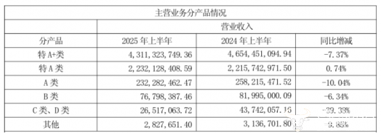 从产品来看,今年上半年,今世缘仅有100元—300元价位的特A类产品收入实现了同比正增长,微增了0.74%,其他品类均有所下滑。其中,300元价位以上的特A+类收入为43.11亿元,占总营收的六成以上,仍为公司营收主力,同比下降了7.37%。