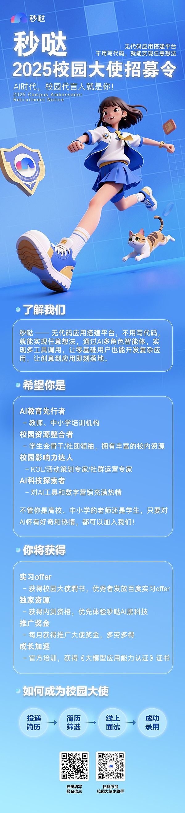 申请流程很简单:投递简历、简历筛选、线上面试、成功录用。关注秒哒微信公众号回复“校园大使”获取报名渠道,这个机会不仅能丰富你的简历,更能为你打开通往AI世界的大门。在这里,你将获得来自百度的专业培训,并在实践中快速成长!